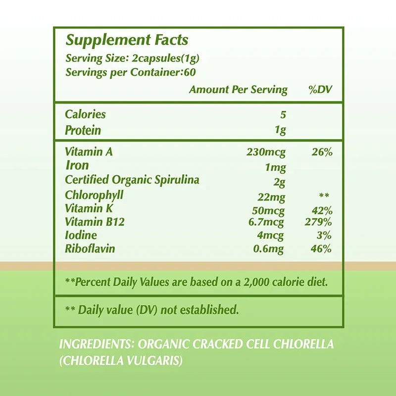 Ingredients: Organic Chlorella, Chlorophyll, Vitamin A
