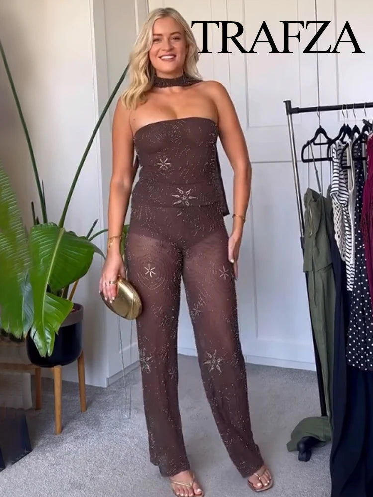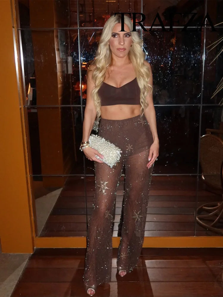 TRAFZA Women Fashion Translucent Tulle Beaded Decoration Mid-Waist Trousers Female Chic Elastic Waist Loose Slim Wide Leg Pants